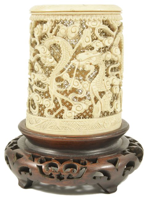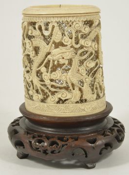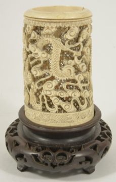 A Chinese 19th century carved ivory brush standthe cylindrical shaped holder carved with several dragons against a pierced ground, on a fitted hardwood stand overall height with stand 17cmCondition: With split to rim approximately 1 cm, otherwise in good overall condition with no major damage