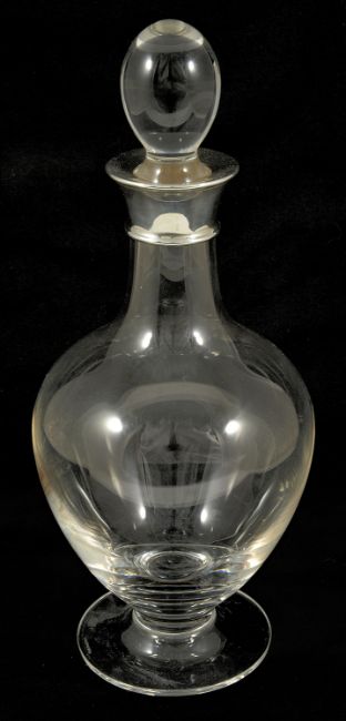 A Darlington glass decanter with silver collar, London 1996the tear drop stopper above a silver mounted collar over a baluster shaped body with circular foot ring, mark to base & Mappin & Webb, height: 30 cmCondition: Condition is good with wear to glass body, no chips or cracks apparent, stopper in good condition, silver collar in good condition, no apparent damage