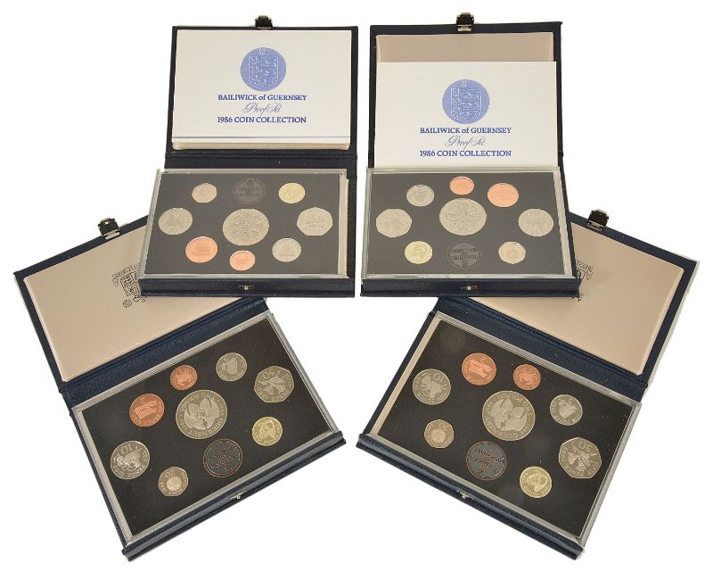 A collection of Guernsey Proof Coin Setsto include two cased eight piece coin sets of 1985 Bailiwick of Guernsey, each set in mounted cases with pamphlet by Guernsey Post Office and two cased eight piece coins sets of 1986 Bailiwick of Guernsey, each set mounted in cases with pamphlet by Royal Mint (4 Sets) Condition: Condition is good for each set, coins and case, each cased in a cardboard box