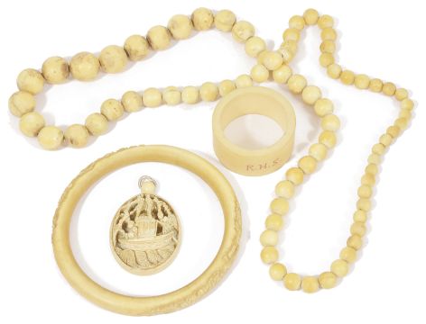 An early 20th century Chinese carved ivory pendant and bangle together with an ivory necklace and single painted napkin ring of similar date, the oval pendant carved with figures in a boat, the bangle with birds amongst blossom (4) pendant measures 5 x 3.7 cm., bangle outer edge diameter 93 mm.Condition: Pendant has remnants of overall cream paint ? also overall rubbing, bangle in overall good condition but has some yellow staining, beads are in need of a clean, some cracking and discolouration