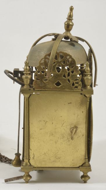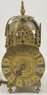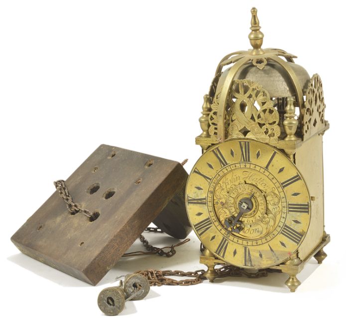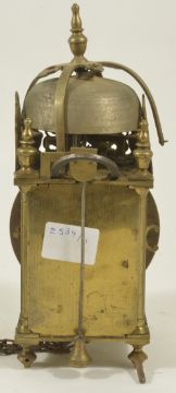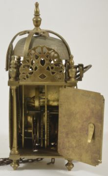 A miniature brass lantern alarm time piecethe 4-inch dial signed John Hatton London, with a single hand, posted weight driven movement, with verge escapement, hanging loop and top mounted bell height: 25 cmCondition: Movement complete and appears to run but in need of a clean
