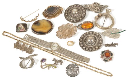 A good collection of Victorian and later silver, gold and other jewelleryto include tiny Georgian oval cameo brooch, tests for gold, a large pair of Scandinavian white metal coiled circular brooches, approx. 6cm. diameter, a large white metal Scottish plaid brooch, a Continental .375 9ct gold fancy link neck chain, ladies Rotary silver bracelet watch, mechanical movement, Scottish agate set silver brooch, heavy white metal floral spray brooch, tests silver, filigree silver, amber set silver brooch, a small collection of mainly silver and marcasite brooches and more, an interesting and varied lot (Q) 9ct chain approx. 23.00 gm.Condition: Overall good, please refer to photo, porcelain brooch has surface wear, Geo. cameo brooch rubbed, 9ct neck chain good, yellow metal agate brooch a.f., silver mounted agate brooch, mount a.f., however the majority of items are in overall good condition