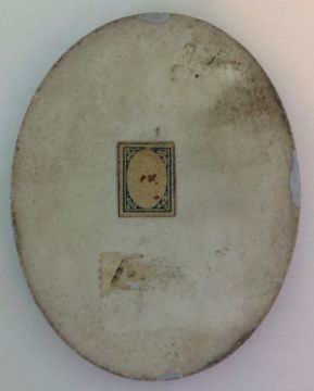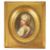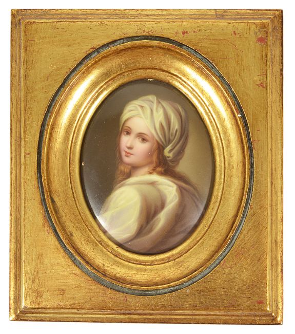 An oval porcelain painted miniature of a girl, early 20th centurymodelled looking over her left shoulder, dressed in turban and robe with her hair trailing down her back, no signature, impressed mark to reverse 15 E, mounted in a gilt rectangular frame measurements out of frame: 8.5 x 6.7 cmCondition: Condition is good for each, appropriate to age, wear to gilt frame, minor scratches to surface.