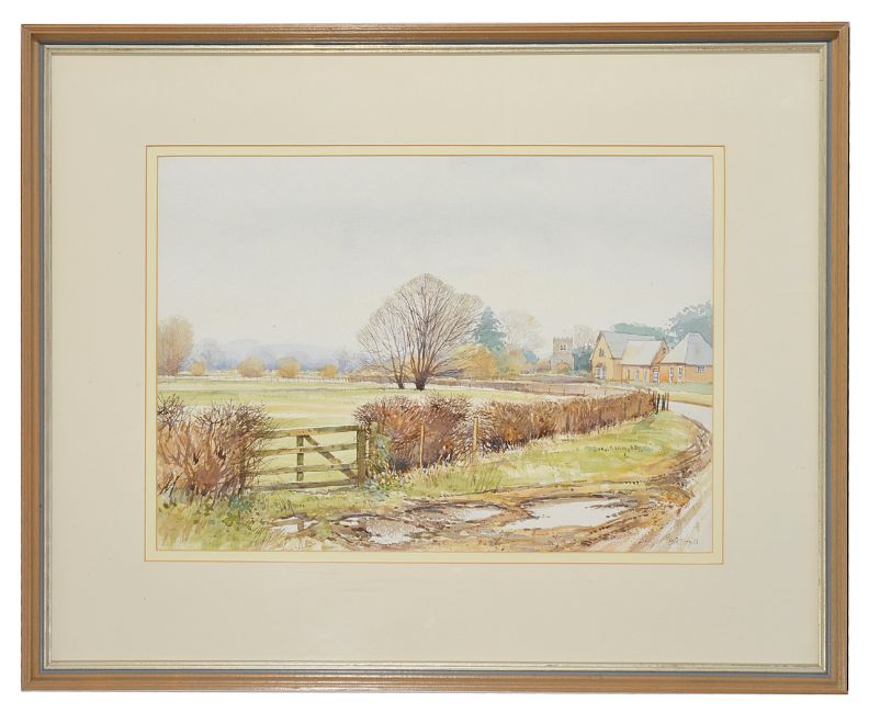 Bill Toop (British 1943 - 2016)mountainous scene with a church and house beside a hedged field, watercolour, signed lower right '88, mounted in a painted frame 57 x 70.5 cm in frameCondition: Condition is good with some wear to frame, watercolour in good condition