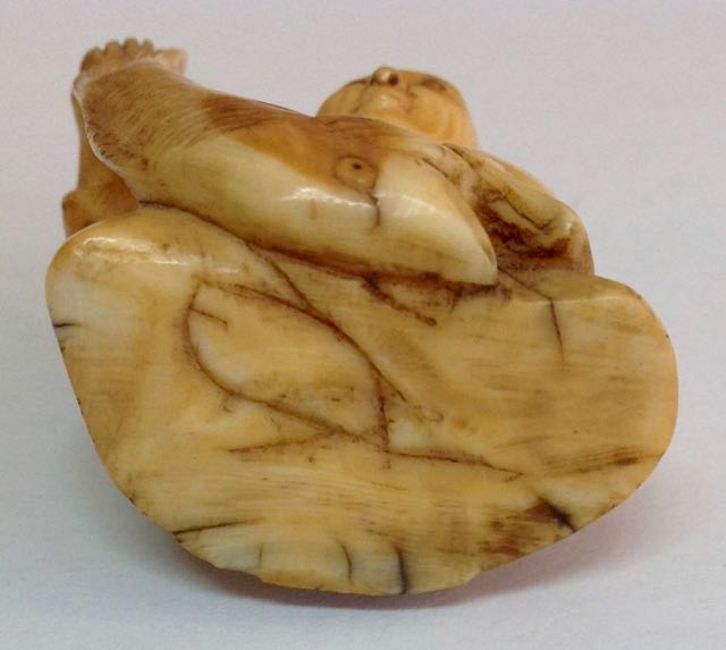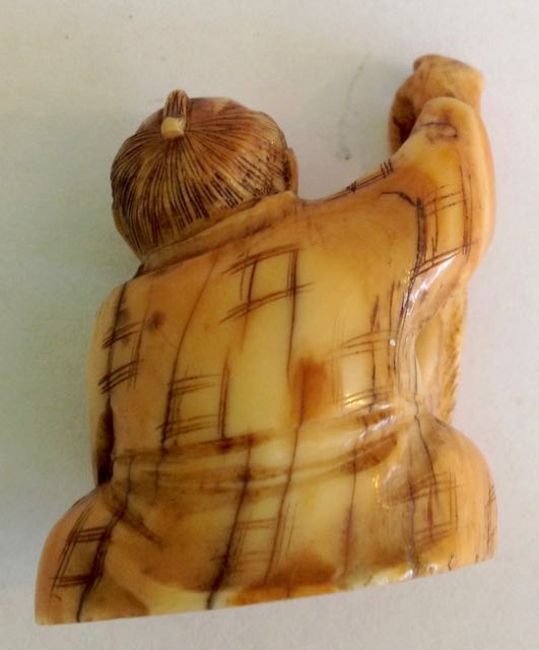 A small ivory Japanese okimono figure the realistically carved figure of seated gentleman holding a carp with both hands height: 3.5 cmCondition: With good patinia with no obvious damage.