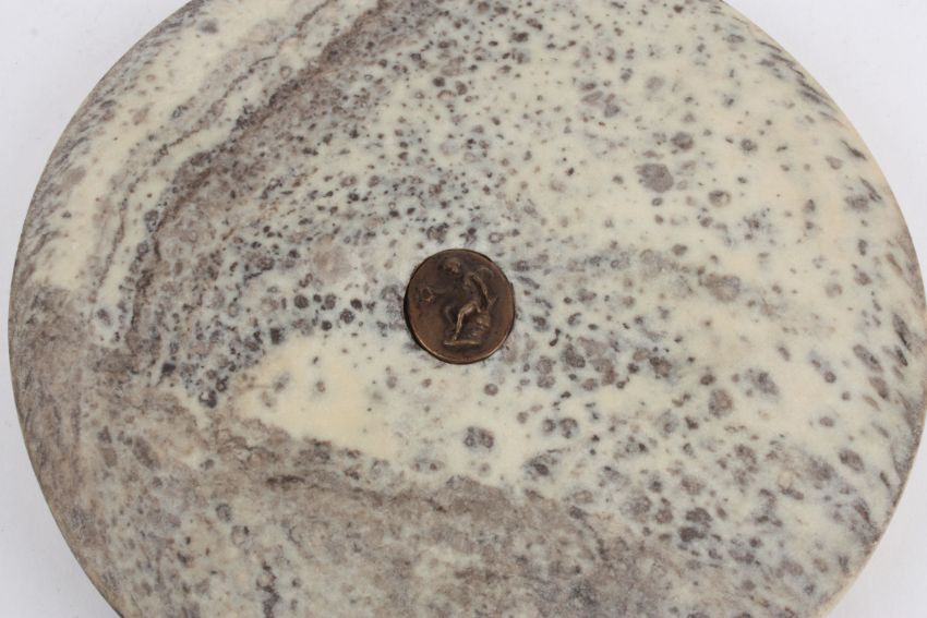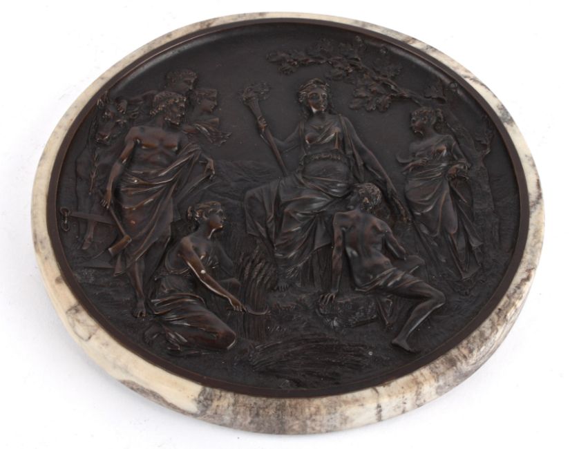 A decorative circular plaque, 20th centurywith composite surrounding the resin central disc, modelled with a maiden seated holding a torch and sheaf of wheat, flanked by further figures and animals, oak tree and sheaf's of wheat, to the reverse is a modelled putti coming through a hole in the composite back total diameter 21.3 cm, diameter of disc 19.9 cm Condition: Good condition, with wear to the composite surround