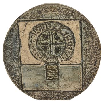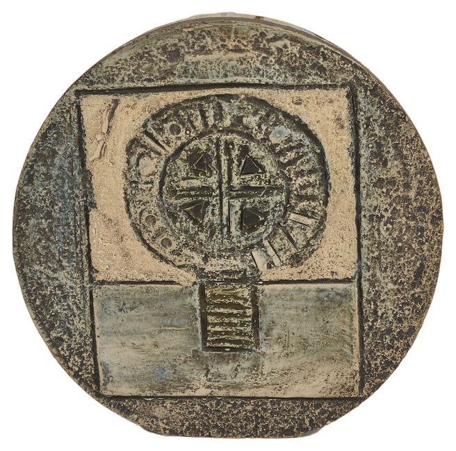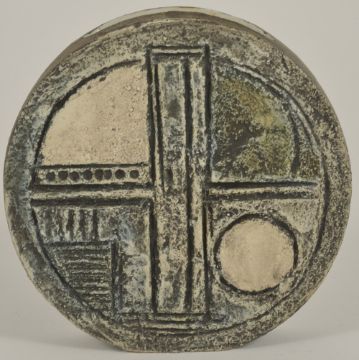A small Troika vaseof circular form with textured finish and geometric patterns to front and back, with painted mark to the underside diameter: 12 cmCondition: In good overall condition with no major cracks or damage. Very minor chip approx. 2 mm