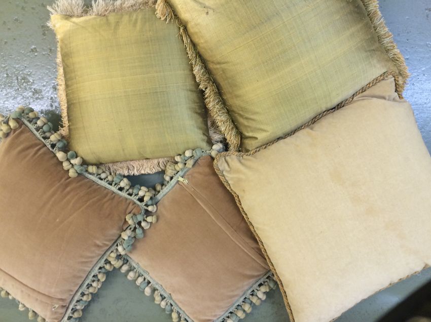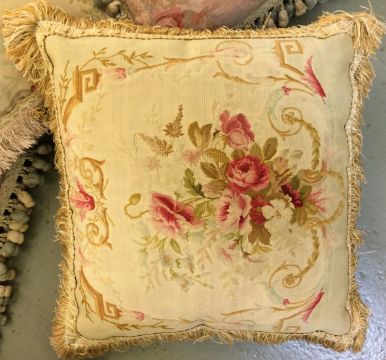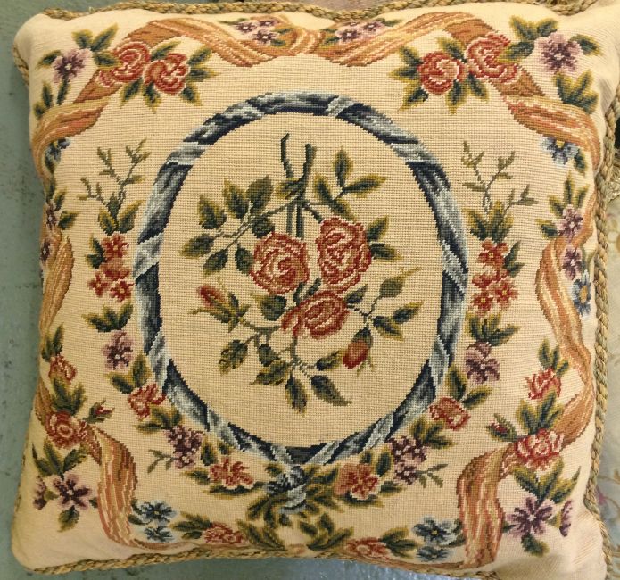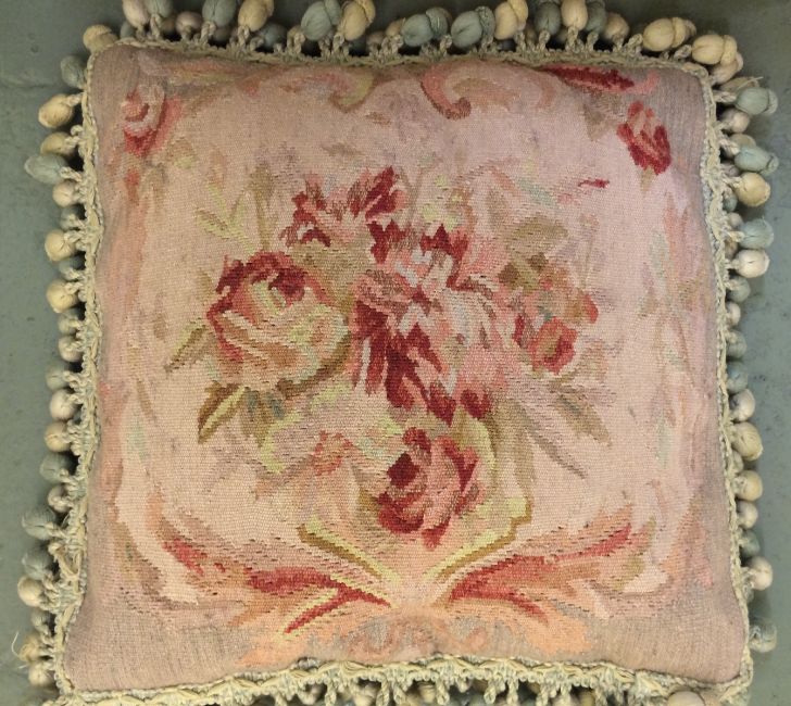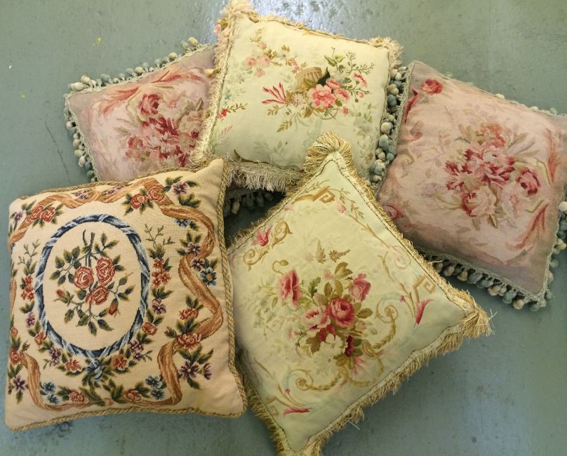 Five French assorted cushions made from antique floral tapestry of rose and ribbon design,comprising a pair or pink cushions and three others (5) approx. 30 cm squareCondition: Light wear, all in need of a clean.