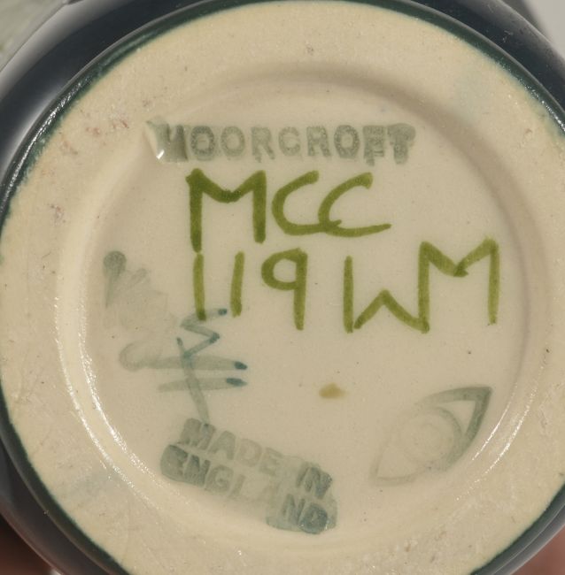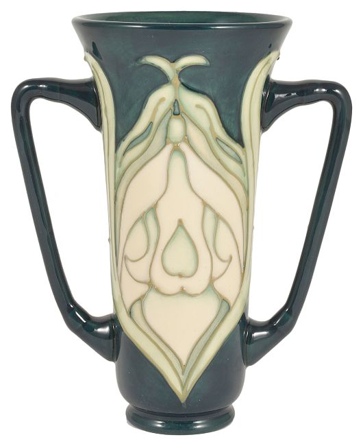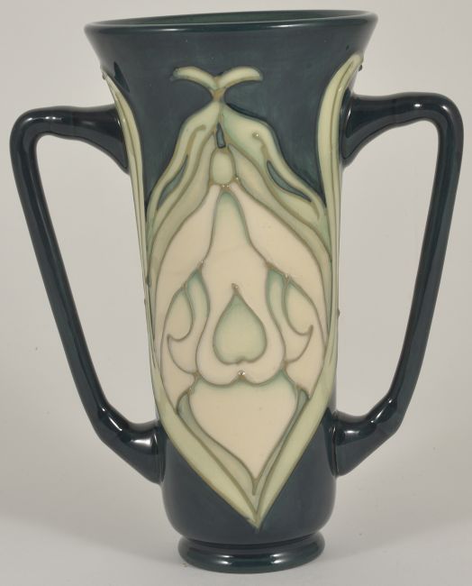 A Moorcroft Collectors Club twin handled vase, with lily pattern tubelined on a green body, green painted and impressed marks to base, height: 15 cmCondition: Condition is good with minor crazing to body