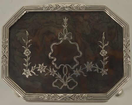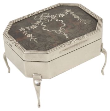 An Edwardian tortoiseshell and silver trinket box, London 1913, of octagonal form with inset tortoiseshell lid silver inlaid ribbon floral details, raised upon cabriole supports, interior lined with velvet, William Comyns height: 6 cm, width: 8.5 cmCondition: Tortoiseshell lid with some discolouration but intact and wear throughout silver, slight dent to side of lid, velvet lining worn