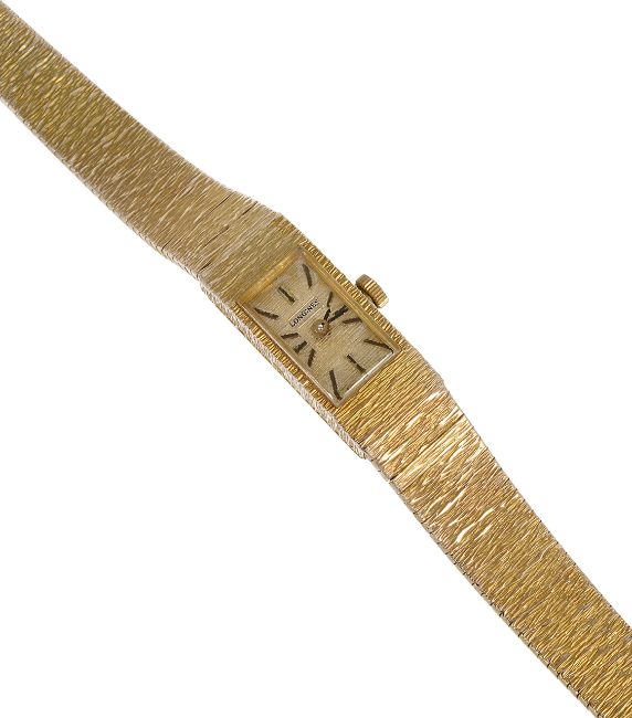 A Longines ladies 9ct gold bracelet wristwatchthe integral bracelet with bark effect finish, having small square dial with baton markers and marked Longines approx. weight including movement 24.5 gm.Condition: Overall good, some wear to dial, sat time of cataloguing, movement in basic working order