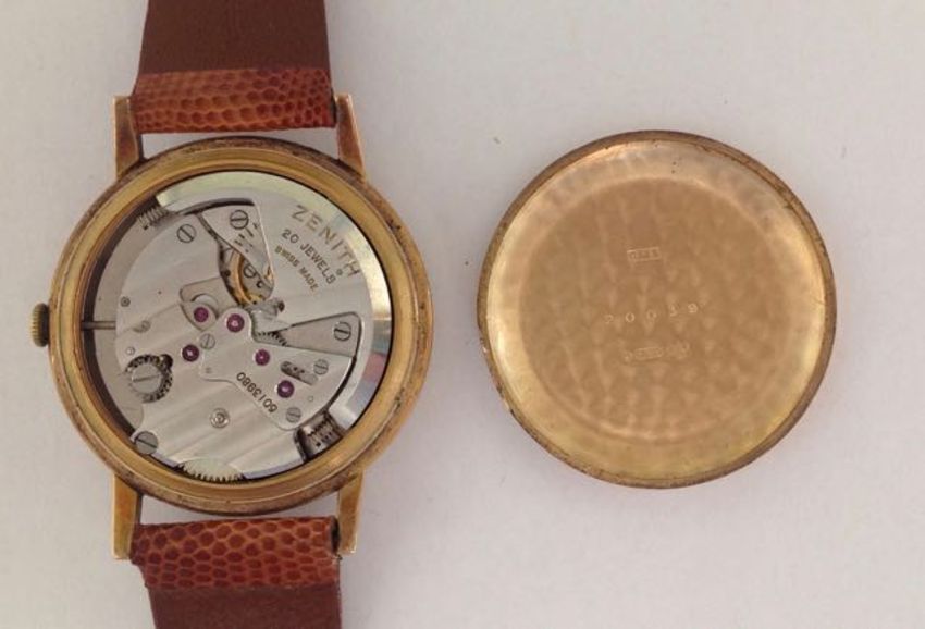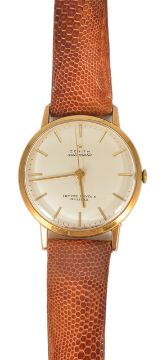 A Zenith 9ct gold gentleman's wristwatch,the circular pale champagne coloured dial with baton hours, marked Zenith Automatic Irvine Hindle Halifax on dial, crown marked z inside a star shape, marked 20039 and .375 in interior of case base, mechanism marked Zenith 20 jewels Swiss Made, with a later brown leather strap with gilt buckle, 23.7 cm total length; 36 mm dial diameterCondition: Condition is good with minor scratches to the crystal, case and back, strap not Zenith, running at time of cataloguing, mechanism Not tested
