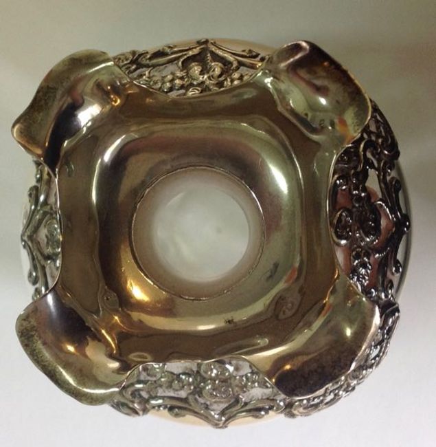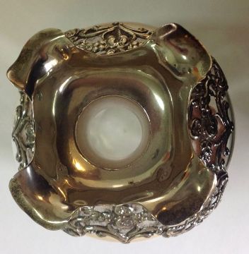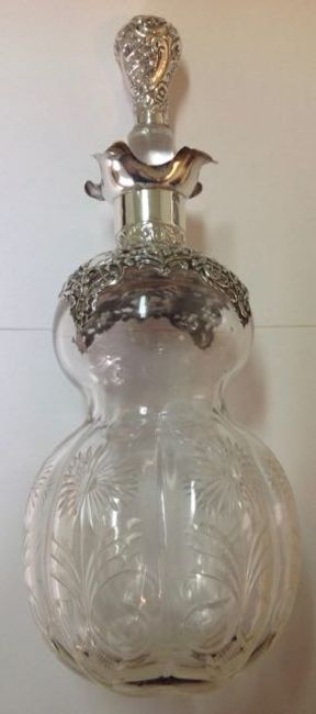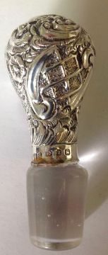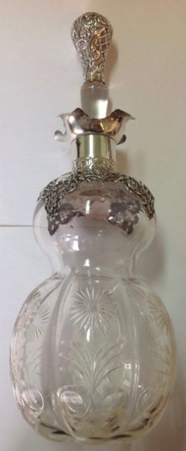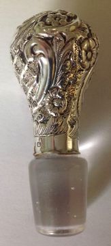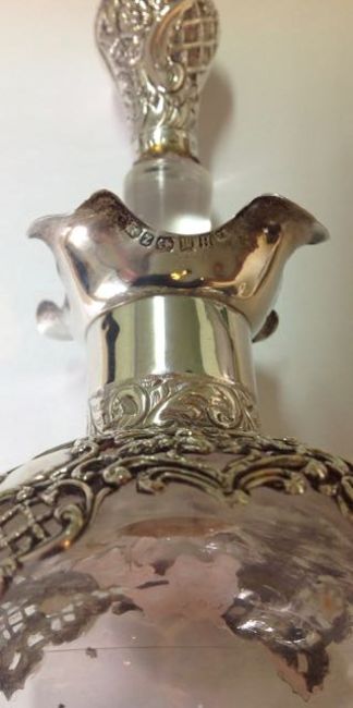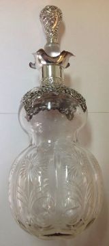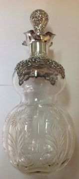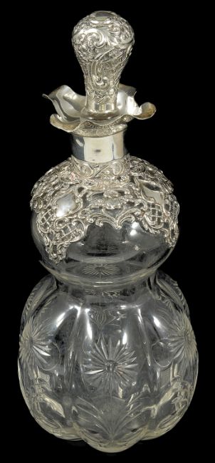 A Victorian silver mounted glass decanter, Birmingham 1899the glass and silver flower head embossed stopper, above double bulbous glass decanter with daisy shaped flower head decoration and shaped silver pierced hatched foliate neck mount, Henry Matthews, total height: 26 cm, stopper height: 8cmCondition: Condition is good for the glass bottle with wear to the silver mounts, chip to the upper section of the glass bottle, the silver stopper mount has been re-glued to the glass section of the stopper, signs of yellow glue, glued unevenly, bubble in glass stopper, hallmarks rubbed