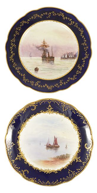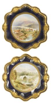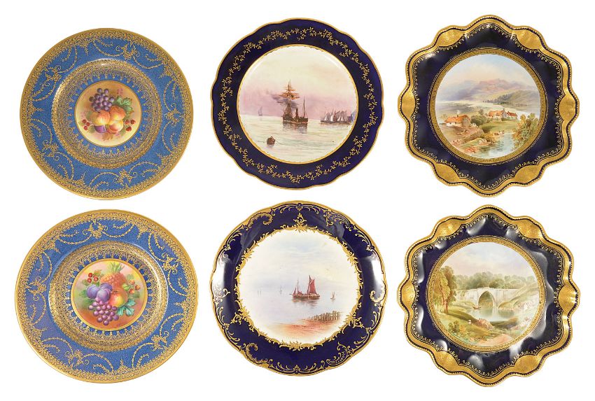 A selection of painted plates, late 19th/early 20th centurycomprising of a pair of porcelain plates by Joseph Birbeck, the wavy gilt edge surrounding a central vignette of a mountainous landscape 'Dungraggan' and a bridge over a river in woodland 'Bridge of Don', both signed J Birbeck, No. 2434, a pair of Crescent George Jones & Sons fruit painted plates, by W Birbeck, the blue and gilt decorated borders with central cartouche of fruit, signed and black marks to reverse and a pair of Coalport plates by PH Simpson, with blue and gilt border surrounding vignettes of sailing ships , green marks to reverse, (6) diameter: others - 23.7 cm; coalport - 22.4 cm; crescent - 22.5 cmCondition: Condition is good with wear to gilt areas, Coalport - minor crazing and scratches to the fronts; Crescent - minor scratches to the fronts; Others - minor scratches to the fronts