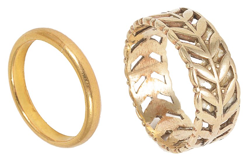 A narrow 22ct gold plain wedding band and another 9ct gold pierced, foliate wedding band, both fully hallmarked (2) 22ct approx. 4.2 gm size, L/M, 9ct approx. 4.4 gm, size TCondition: 22ct ring side wear to one side, some surface rubbing, would benefit from a clean