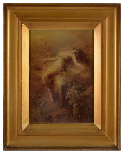 Edouard Bisson (French 1856 - 1939)a sepia hued crystoleum of a scantily clad female laying amongst a garden of flowers, signed lower right and dated 1901, in a gilt frame, and a Alfred Seifret (Czech 1850 - 1901)a crystoleum of a female portrait, signed lower right and dated copyright 1897 E Bisson: 27 cm by 19 cm, A Seifret: 12 cm by 9 cmCondition: Condition is fair for both, frames have wear, Alfred Seifret crystoleum has signs of wear to edges, Edouard Bisson crystoleum has minor wear to surface, A/F
