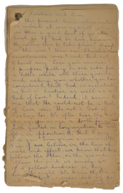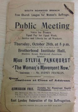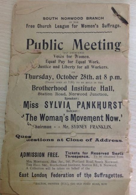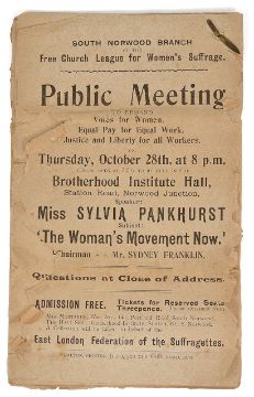 Suffragette interest: A collection of leaflets advertising a talk by Silvia Pankhurst 1915 comprising 18 identical sheets reading 'Public Meeting to demand Votes for Women Equal Work Justice and Liberty for all Workers, Thursday October 28th at 8pm, 1915', with hand written speech on the reverse believed to be by another hand 21.5 x 13cmCondition: Most pages with some tears and general damage to the edges. Fragile.