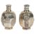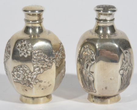 Two Japanese silver pepperettes, Meji Periodof octagonal form with twist on pierced lids, the panels prunus blossom and waterlilies, upon circular foot ring, mark to base, (2) 6.7 cm highCondition: Condition is good with minor dents and scratches, one lid can't open, which is also tarnished.
