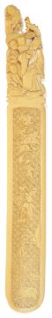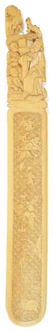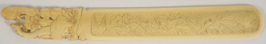 A fine Chinese ivory page turner, 19th centurythe top finely carved in relief with a scholar and children seated on a rocky ground, above a rounded end blade with low relief hatched, bird and flower head carving on both sides, length 29.8 cm, width 3.9 cmCondition: Condition is good, yellowing throughout, minor scratches throughout