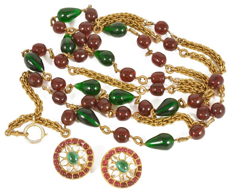 A pair of vintage Chanel Gripoix glass ear clips, Spring '94 collectioncircular in shape with central Indian inspired floral design in green, red and clear glass, fully marked to reverse, together with a similar Gripoix coloured glass bead long chain necklace/sautoire, without tag but probably Chanel (2) approx. 32 mm diameterCondition: Gripoix ear clips Overall good, no visible damage or rubbing, clip in good order - large pearl clips, some scratching to the 'pearls' and one crystal