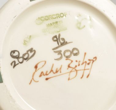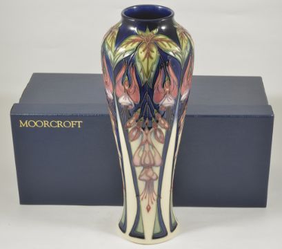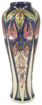 A Moorcroft pottery Marinka vase, by Rachel Bishop, dated 2003of tall slender proportions with tube lined floral decoration, signed Rachel Bishop to base with painted and impressed marks, No. 96 of 300, in original box height: 37 cmCondition: Good condition with clear marks to base, no apparent crazing or blemishes to the body or base, box in good condition
