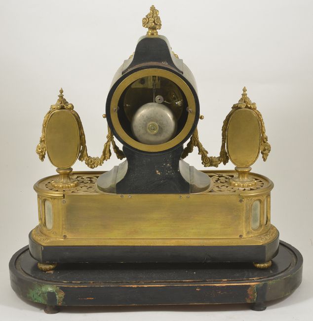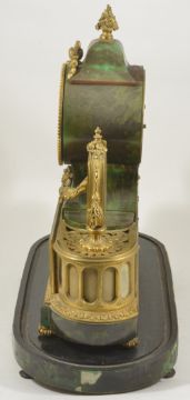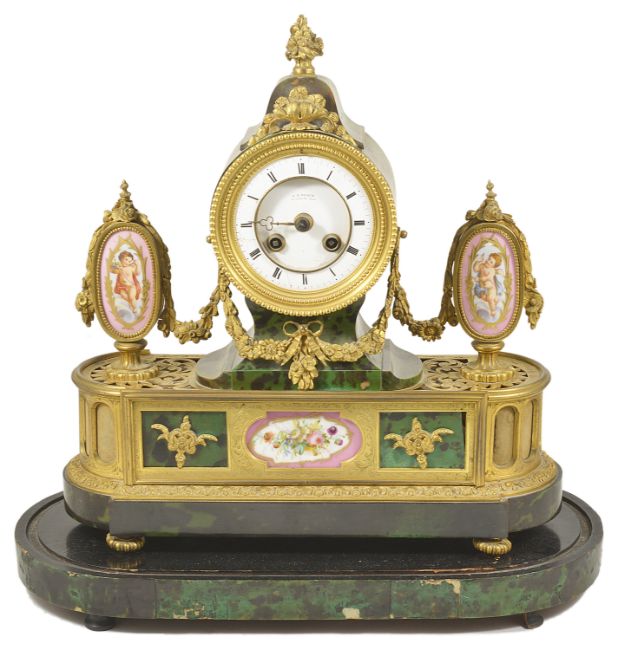 A French porcelain mounted ormolu mantle clockcirca 1860inset with simulated green stained turtle shell, and three panels of pink porcelain decorated with putti and flower sprays , with white enamel dial signed with retailers name A.B. Pearce, Ludgate Hill, on fitted ebonised base with similar turtle shell height 40cm, base 30cmCondition: Hair crack to dial, minute hand detached but present. Some wear and cracks to turtle shell and some panels missing to side and base. No glass dome. Bell striking movement complete but in a need of a clean. Has pendulum and winder. Some wear to ormolu.