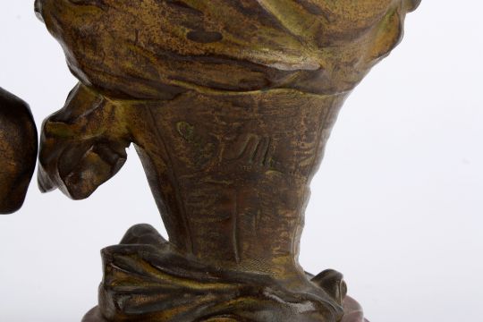Auguste Moreau, French (1826 - 1897)a pair of gilt bronze busts, each modelled as a lady in 19th century dress, raised upon stepped circular marble bases, both signed to reverse (2) height 14 cm, height 13 cm lady with hatCondition: Good condition, wear to gilding