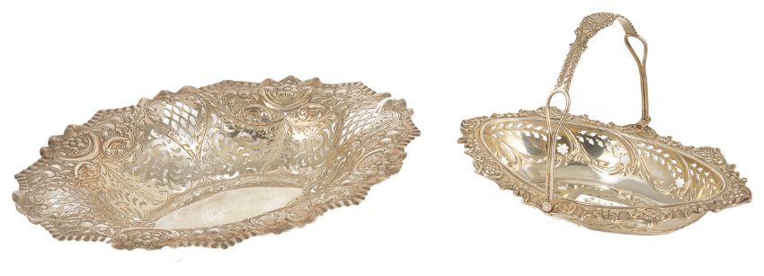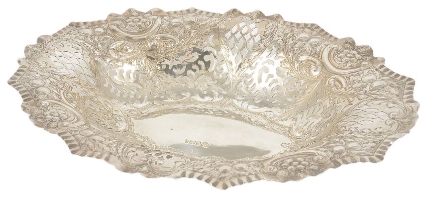 A Victorian silver pierced bon bon dish, Sheffield 1897the shaped pie edge border embossed with berries and pierced sides, Cooper Brothers, together with a silver sweet meat basket (2) bon bon dish: height: 2.5 cm, width: 24.5 cm, overall weight of the two 10.5 ozt approxCondition: Condition is good with overall wear, edges slightly bent, pierced work in good order, hallmarks clear