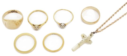 A small collection of gold rings and other items to include an 18ct gold band, another, tests gold, a 9ct gold band and signet ring (a.f), a small rose coloured chain, tests for gold, two small illusion set diamond rings 9 (a.f.), and a mother of pearl small crucifix pendant (7) 18ct gold and tests gold bands approx. 6.3 gm., 9ct band and signet ring approx. 6.9 gm., chain approx. 3.1 gmCondition: all items have wear or some damage
