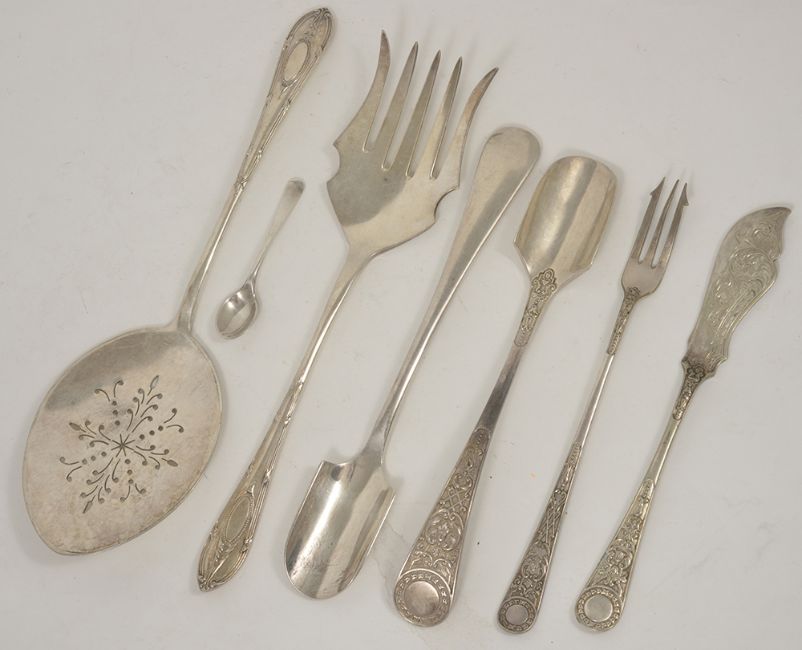 A small collection of silver plated items including a plated tea caddy, two bull knife rests, fish servers, two stilton scoops etc height of tea caddy: 14 cmCondition: Fair condition