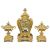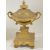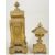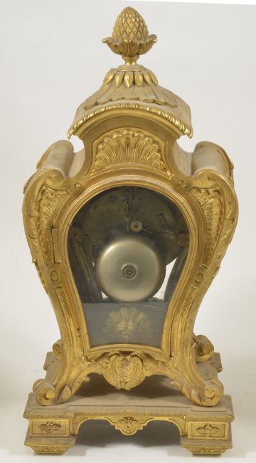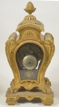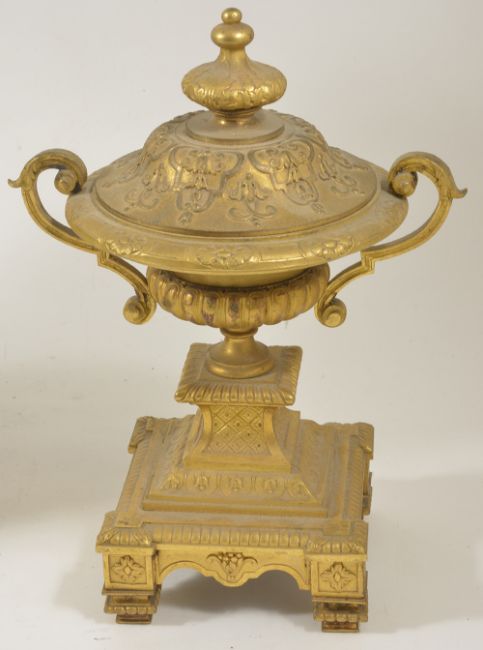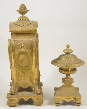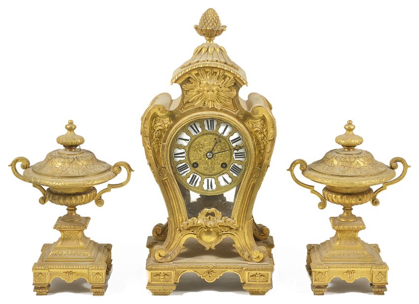 A French gilt bronze clock garniture circa 1870the movement stamped Japy Freres, with twelve piece enamelled cartouche dial signed for Martin and Co. Paris & Cheltenham, the bell striking movement with Brocot escapement and sun masked pendulum, with waisted case, raised on breakfront plinth with cone final, the sides with medallion portraits, with a pair of conforming urns height: 38 cmCondition: Movement complete but in need of a clean and overhaul