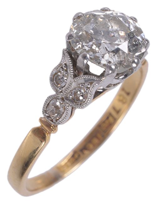 A large single stone diamond set ringapprox. size 1.60ct, the stone in 18ct and platinum foliate mount with diamond point detail and diamond set shoulders, associated box size M/NCondition: Chip to main stone under one claw, inclusions both dark and light throughout the stone, almost visible to the naked eye, draws some colour
