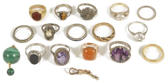 An interesting collection of antique gold rings and silver dress ringsto include a yellow metal carnelian signet ring, tests gold, a 9ct gold cabochon set ring, a 22ct gold band, 9ct fancy bird mounted ring, 18ct and platinum mounted paste ring, a yellow metal mounted malachite ball drop pendant, 9ct clip, a selection of various silver mounted rings including marcasite and more, a varied lot (Q) carnellian ring size K, approx. weight 6.5 gm. cabochon ring J, 22ct band Q, approx. weight 3.5 gm Condition: Overall majority of items are in overall good condition, some wear, large circular purple paste dress ring mount af one claw absent, oval seed pearl mounted silver ring a.f. top section separated from mount