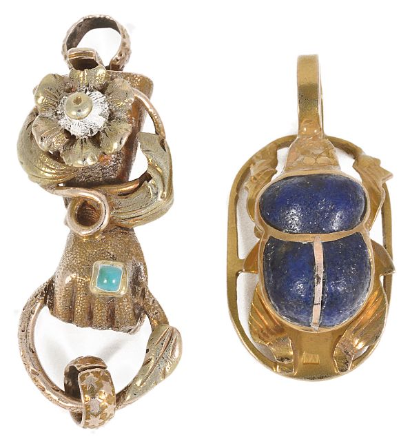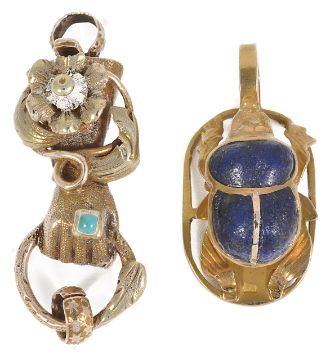 A Victorian two colour gold fancy 'hand clasping ring' clasp and a scarab pendantthe clasp modelled as a hand with turquoise set ring and floral covered cuff grasping a coiled snake ring, with detailing also to reverse, together with a later lapis lazuli set scarab pendant with Continental yellow metal mount and overlay, both items test for gold (2) total weight for both items approx. 6.6 gm. hand clasp approx. 3 cm., scarab approx. 2.5 cm.Condition: Overall good, clasp very slight rubbing commensurate with age, scarab pendant lapis surface rubbed and has lost polish