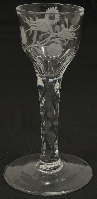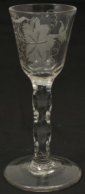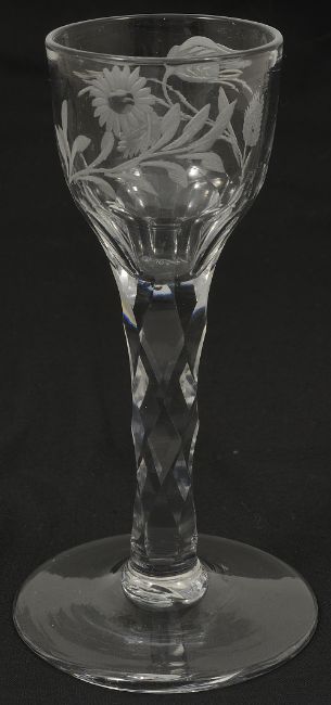 Three 18th century Cordial glassescomprising of a pair with etched bowls decorated with flowers above faceted stems upon circular foot and a third with etched bowl decorated with berries and a bird above a faceted stem with circular foot, (3) height: pair - 14.6 cm; other - 14.5 cmCondition: Condition is good for each, minor scratches to the bowls