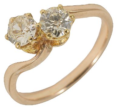 An Edwardian two stone diamond set crossover ringthe stones approx. 0.25ct each and with light yellow tint, mounted in yellow metal setting, tests for gold size MCondition: Overall good, wear commensurate with age, very tiny edge chip to one stone