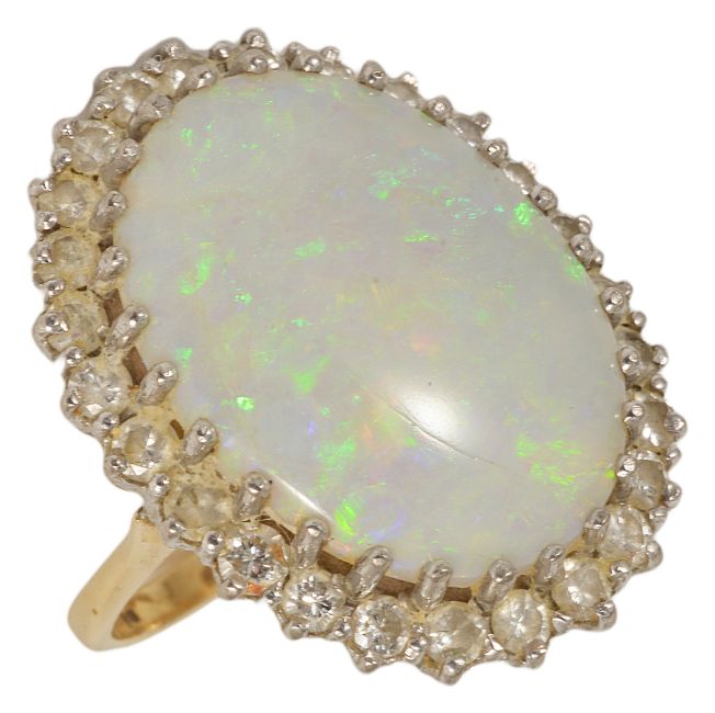 A large oval opal and diamond set cluster ringthe oval precious opal measuring approx. 22 x 17 mm. displaying predominantly green and blue set within a single row border of twenty six small diamonds, 18ct yellow and white gold mount opal approx. 22 x 17 mm, total diamond weight approx. 1.30 ct. ring size M, total eight approx. 11.3 gm. Condition: surface line to opal and some overall surface wear, not visible to the naked eye, diamonds even size and colour