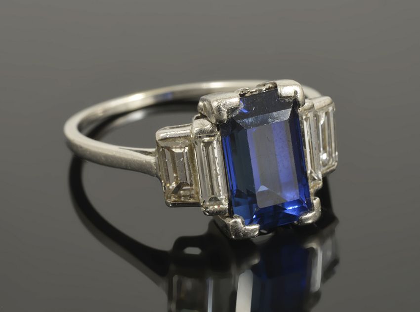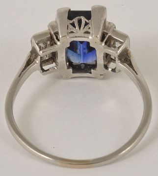 An Art Deco blue gem (synthetic sapphire) stone and diamond set ring the central rectangular emerald cut stone flanked by a pair of baguette diamonds and a further rectangular cut diamond to either side, stepped white metal mount size P Condition: Overall good, diamonds are clean, bright, lively and matched, we can confirm that the blue gem is a synthetic sapphire