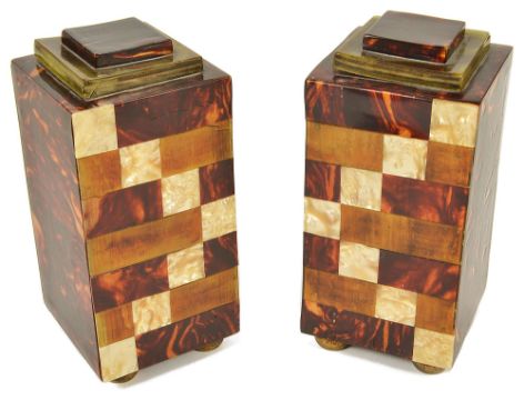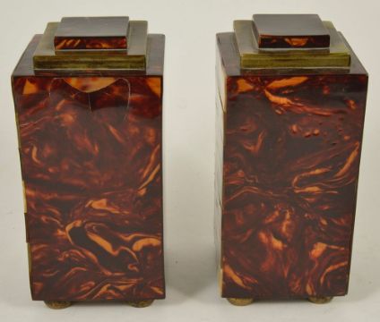 A pair of faux tortoiseshell veneered garniture square section columns, with stepped tops and pad supports, (2) height: 16.5 cm, width: 7.7 cm, depth: 7.5 cm Condition: Fair with cracks to veneer and top stepped section slightly warped