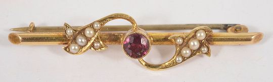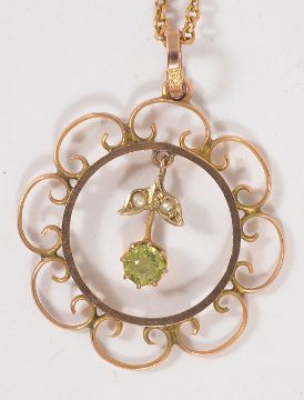 An Edwardian peridot and pearl floral pendant on chainpendant marked 9ct. and chain tests for gold, a garnet and half pearl scroll bar brooch, a gold mounter mother of pearl tear shaped gem set bar brooch, together with a simple 9ct gold twist band ring (4)ring size P approx. 2.6 gm., pendant with loop approx. 3.5 cm. approx. 4.3 gm.,, brooch 42 mm acrossCondition: Pendant on chain overall good, brooch replacement white metal pin,