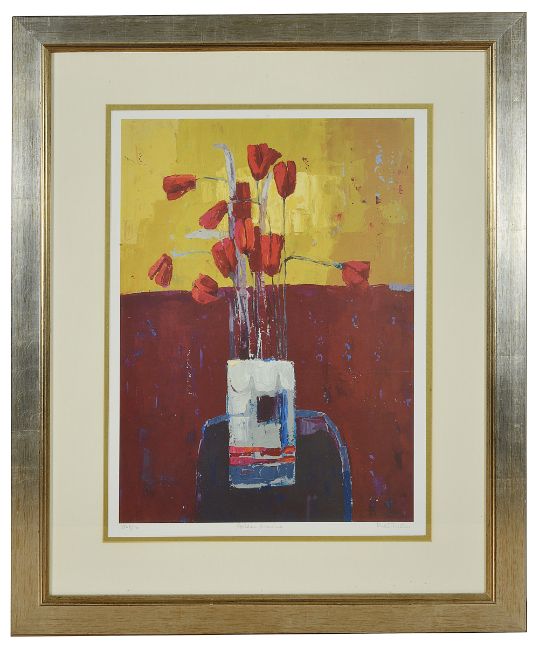 Kirsty Wither (British b.1968)two floral limited edition prints, signed and framed, entitled 'Golden Evening' 336 of 500 and 'Tulips in Marsh' 306 of 500, (2)total frame: 77.5 x 61.5 cmCondition: Good with slight wear to the frames