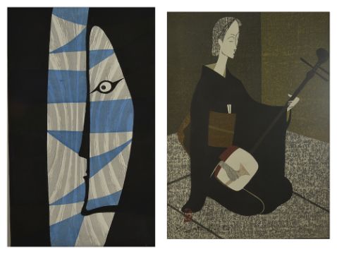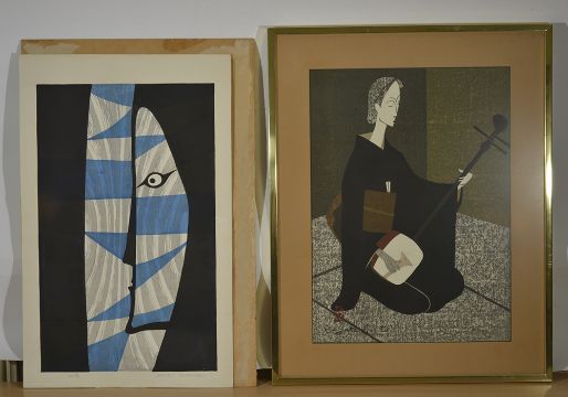 Takumi Shinagawa (Japanese 1908 - 2009)Kabuki Actor (Halyu) woodblock print, signed in pencil lower right, together with another framed Japanese print of a lady playing an instrument, indistinctly signed, (2)62.5 x 39.2 cm, framed print: 67 x 53 cmCondition: Fair to good, with wear edges, staining and water damage to print, slight tear to one edge, framed print wear to frame