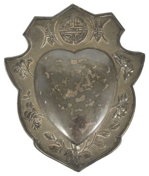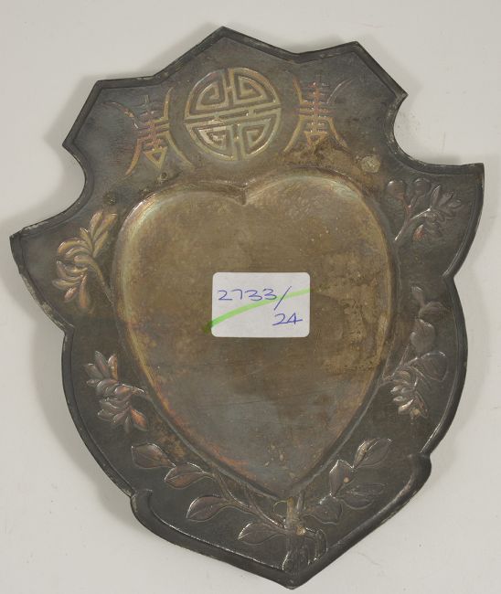A Chinese export silver embossed heart shaped plaquewith central heart surrounded by branches and shou character to topheight: 19.5 cm, width: 16 cm, weight: 3 ozt approx.Condition: Fair, with wear throughout, pierced hole at bottom of heart