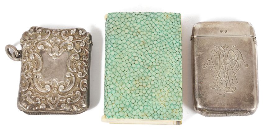 A selection of silver and ivory/shagreen vesta casesa Victorian silver vesta case, Birmingham 1880, with engraved initials to the front and cranes in water to the reverse, by Howard James, a Victorian silver vesta case, Birmingham 1899, with foliate embossed body with central cartouche, by Henry Matthews and a ivory and shagreen double ended vesta case, (3)weight: 1.8 ozt approx.Condition: Fair to good with wear to the silver cases, minor scratches to bodies, dents to bottom corners, wear to ivory case, scratches to body and staining,