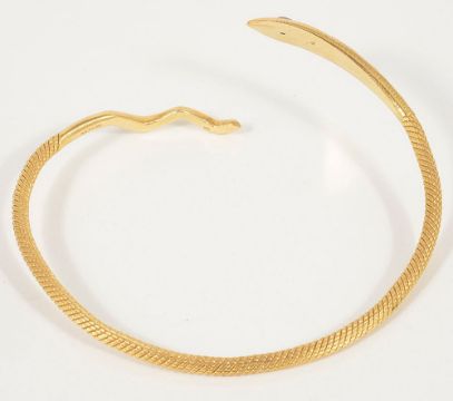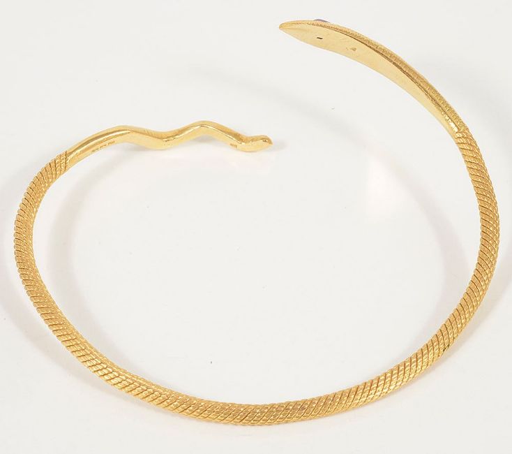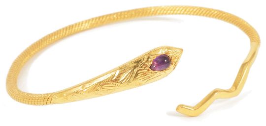 A contemporary 18ct gold woven snake banglethe serpent's head set with a single tear shaped cabochon amethyst and with bright cut detail, import marks for 18ct goldapprox. weight 26.4 gm.Condition: Bracelet mesh section is slightly misshapen, there is evidence of light wear