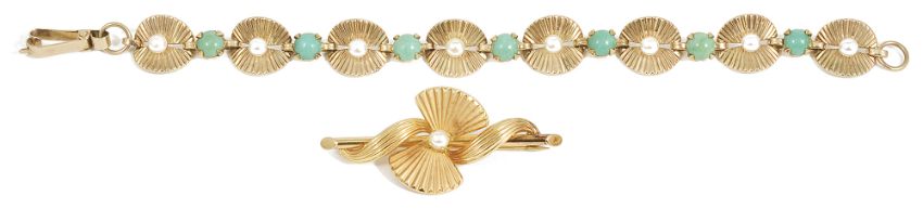 A Continental turquoise and pearl set sunburst link bracelet, circa 1950each rose gold sunburst link set with with central pearl and each link spaced with a circular claw set turquoise cabochon, each link stamped 9ct, together with a 'Richelieu' brooch of similar design, marked '12 Kt gold front' to reverse (2)bracelet weight approx. 19.2 gmCondition: Overall good, crisp detail no undue wear to links