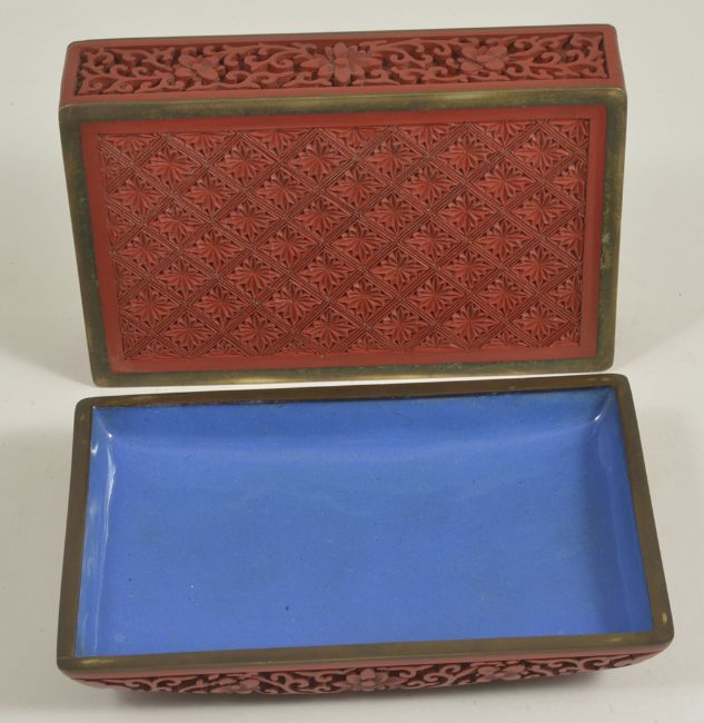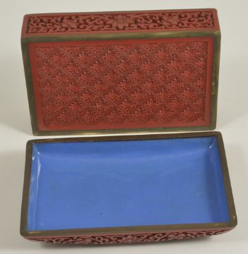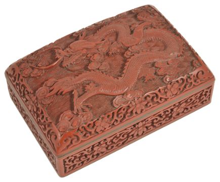 A Chinese rectangular carved cinnabar lacquer dragon box and cover, 20th centurythe lid carved with a five claw dragon amongst cloud scrolls, the sides with prunus blossoms and scrolls, blue enamelled interior and carved lacquer base,height: 5.5 cm, width: 15 cm, depth: 10 cmCondition: Good condition, with minor scratches to body