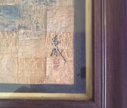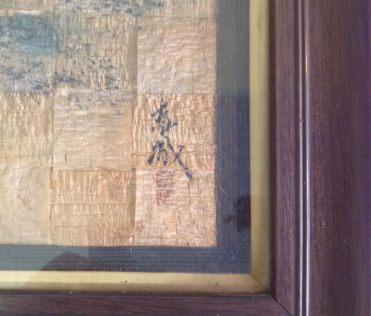An Oriental interwoven wooden scene, 20th centurythe rectangular interwoven wood hand painted with a boat sailing, bears character marks, in a wooden frametotal frame: 56 x 32.2 cmCondition: Fair with obvious wear throughout, chips to corners