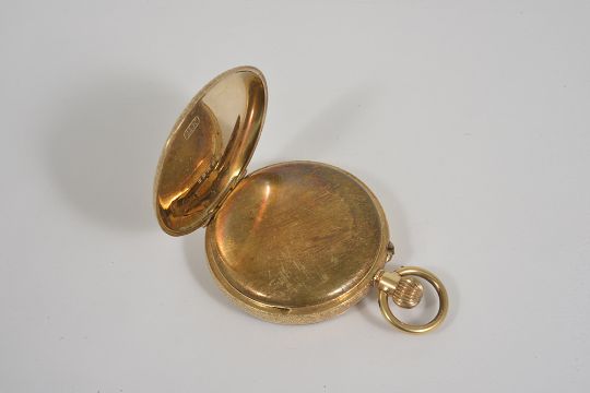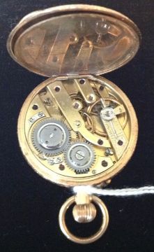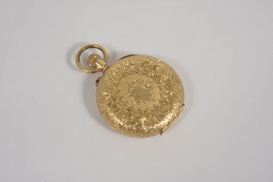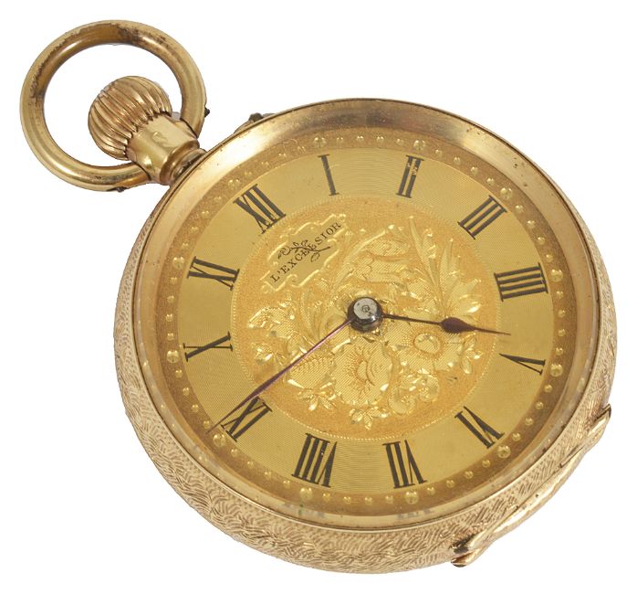 A 14k L'Excel Sior gold ladies open faced pocket watch,with black painted roman hours and dot minutes with spade hands, foliate engraved dial, the outer case with floral engraving, marked 14k to inside of outer caseglass diameter: 30 mmCondition: Good with minor wear and scratches to body and glass, wear to black painted numerals, slight dust in dial, keeping time at time of cataloguing, mechanism NOT tested