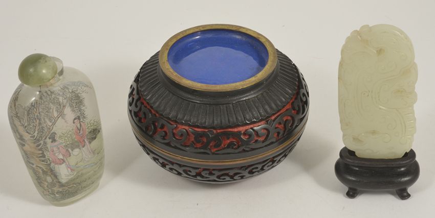 A Chinese contemporary carving of a dragon tablet on standtogether with a contemporary cinnabar lacquer circular box and cover and an interior painted glass snuff bottle, (3)height of tablet: 7 cm, box - 5.5 cmCondition: Fair to good, with wear to each item